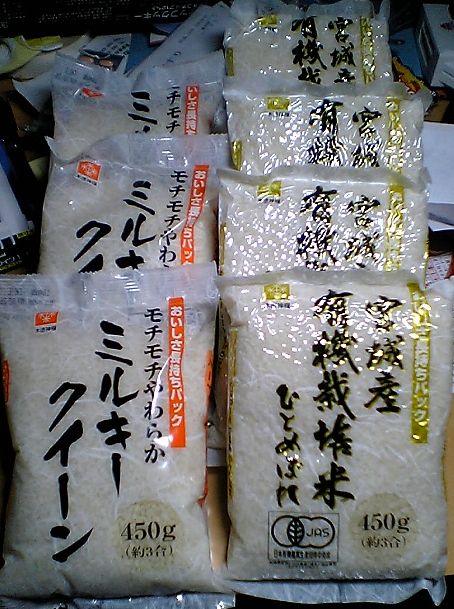 「宮城産有機栽培米 ひとめぼれ」3合パック(右)が4つと,「ミルキークイーン」3合パック(左)が3つ.