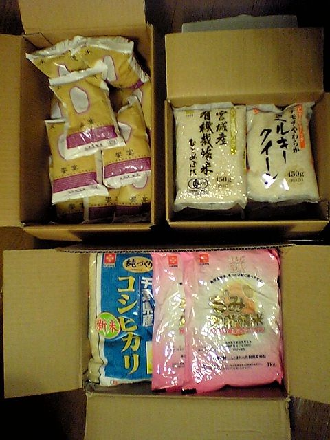 以前はずっと同じ「米浪漫 饗宴(うたげ)」なる2合ずつ小分けにされたお米だったのだが,うーん,前回は違う種類のお米(2000円分)が来た.