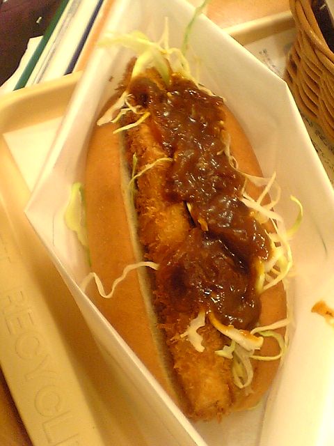 見て分かるように,通常はチリドッグなどに使っているパンに,ソーセージではなく棒状のトンカツを挟み,そこにデミグラスソースをかけたもの.