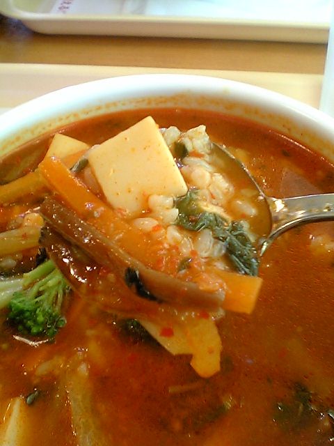 トマトスープのように赤いのだが,まったくトマトは入っておらず,この赤みは唐辛子やコチュジャンによるもの.