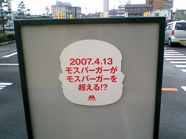 あと,今回はトレイに敷かれた紙に「2007.4.13 モスバーガーがモスバーガーを超える!?」という告知がされていた.露出する情報を小出しに制限していく,いわゆるティザー広告だ.