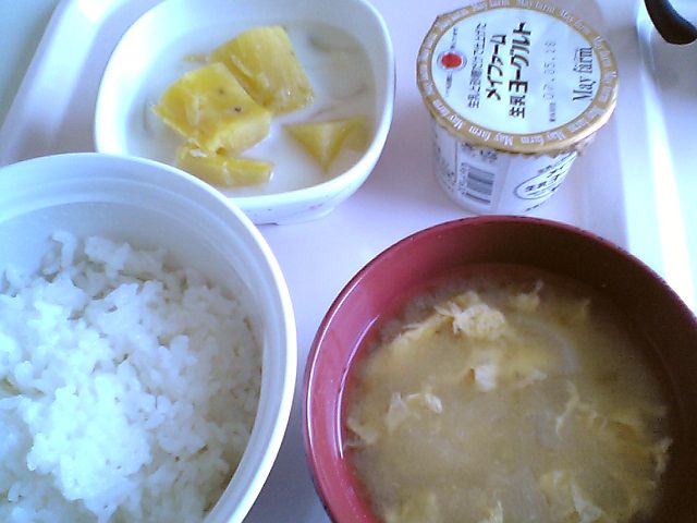 朝食は白ご飯に汁物,一品にデザートのヨーグルト,というのが基本パターンだったのだが,この日のメニューは,白ご飯に卵とタマネギの味噌汁,そしてタマネギとサツマイモの牛乳煮.