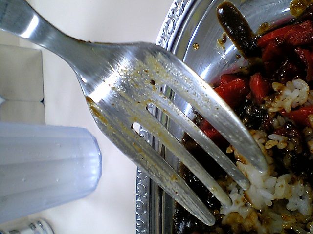 カレー自体はスプーンでもフォークでも食べられるけど,カツなどのトッピングについてはフォークの方が食べやすいから,やっぱりここでもトッピング前提なんだろう.