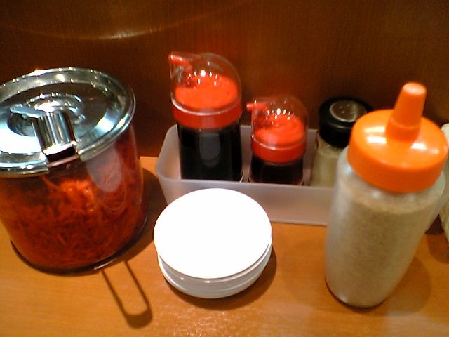餃子用の調味料に加えて,紅ショウガとゴマが.博多ラーメンのトッピングとしてはメジャーなものだけど,ここって久留米ラーメンの店だよな?