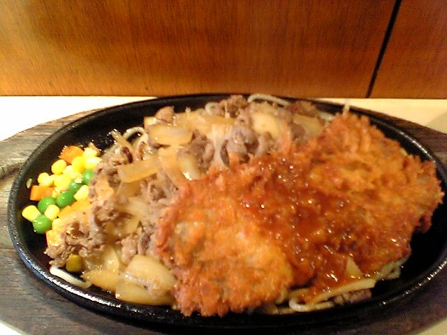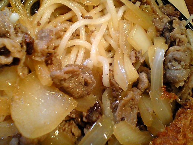 タマネギと肉を炒めたのがカロリー焼きというものらしい.セットになっていたカツはちょっと薄め.