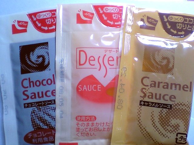 キャラメル,マンゴー,チョコレートのソース.