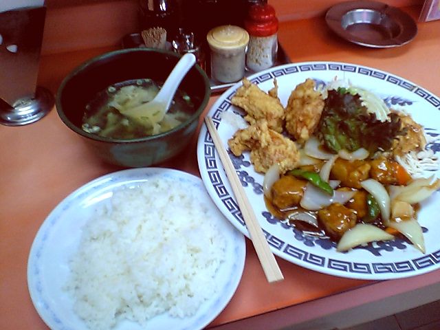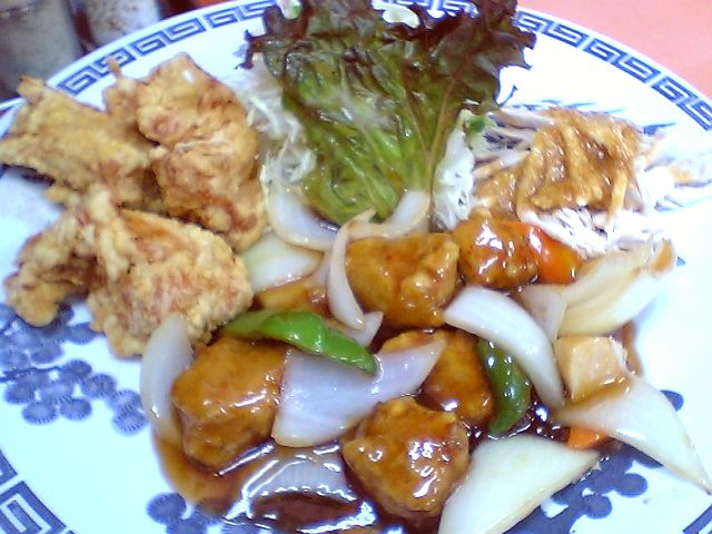 鶏の唐揚げ,酢豚,棒々鶏のセット.棒々鶏は春巻きに替えることも可能だったような気がする.