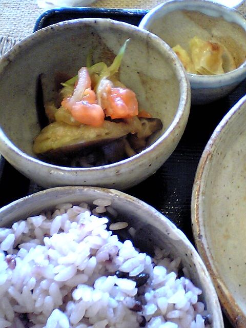 あと,味噌汁,漬物,ジャガイモと大豆の煮物の計7品(ご飯もの含む).